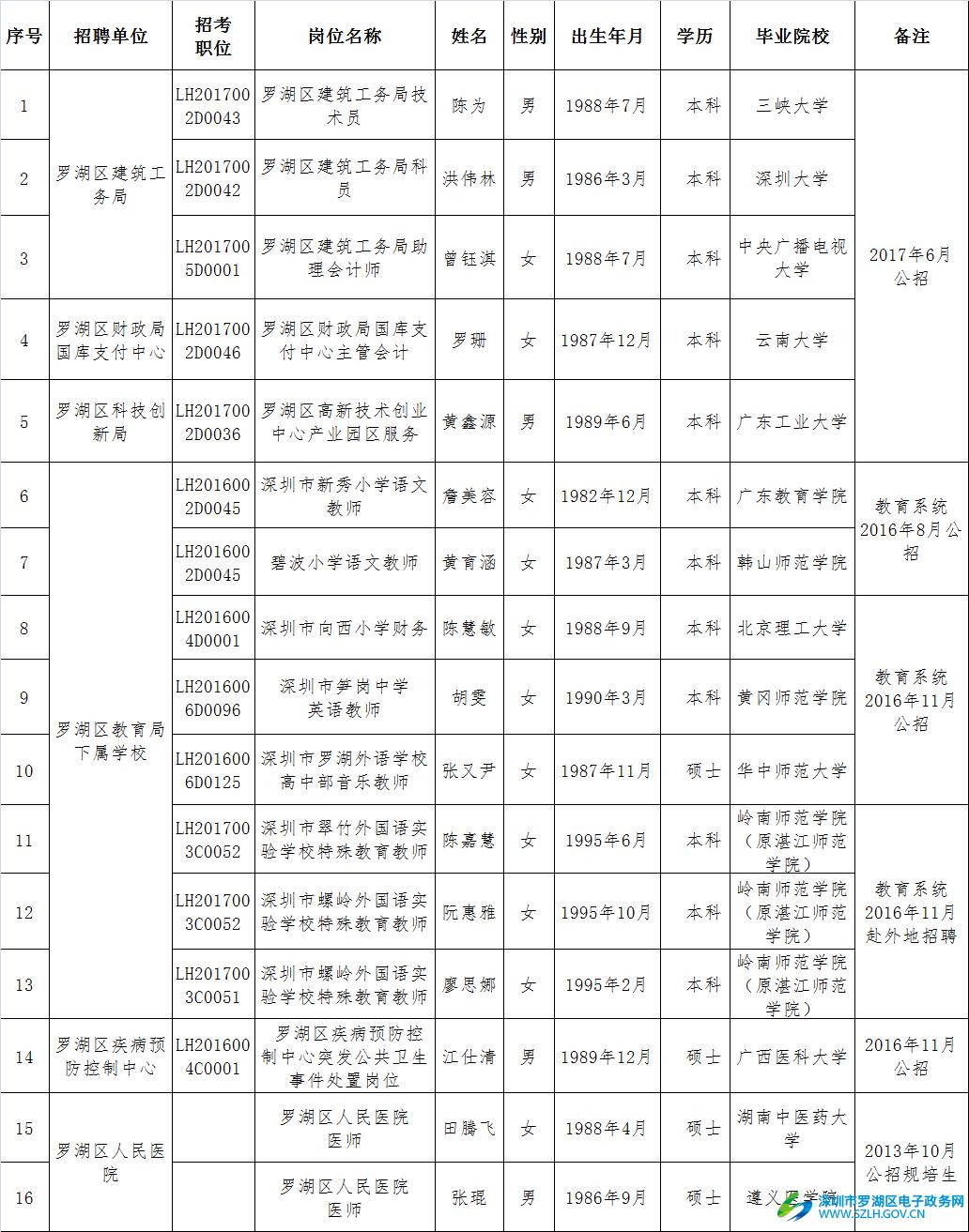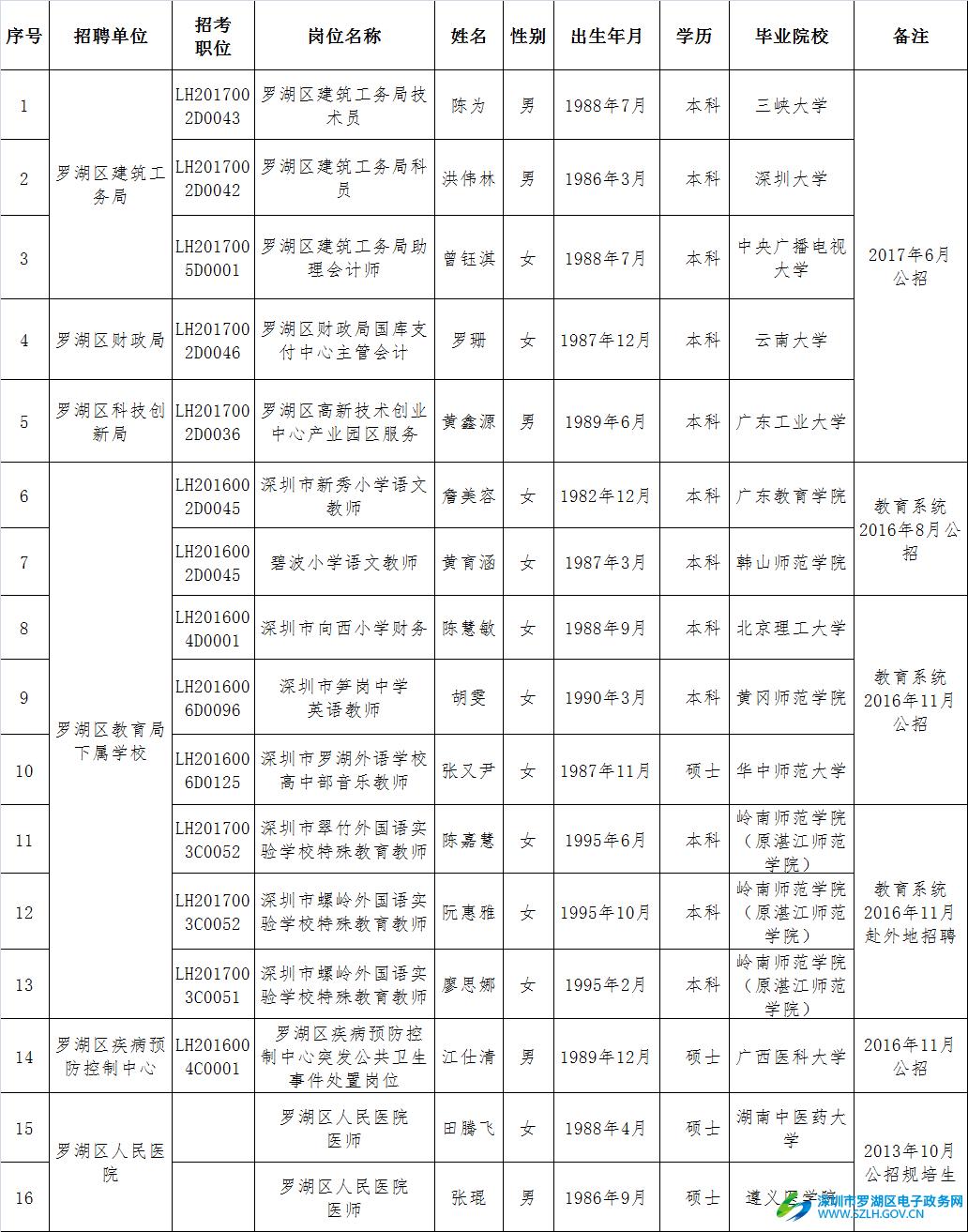 根据招考公告的要求,经公开考试、体检、考察等程序,现对拟聘用人员进行公示,公示时间为2017年9月4日至9月11日。公示期间,任何单位和个人均可通过来人、来电、来信等方式向罗湖区委组织部(地址:深圳市罗湖区文锦中路罗湖管理中心大厦11楼1110室职员与雇员管理科,联系电话: 25666269,投诉电子邮箱:lh_zzbjdk@szlh.gov.cn,邮政编码:518021)反映公示对象存在的问题。反映情况和问题必须实事求是,客观公正。反映人必须提供真实姓名、联系单位、地址和电话,以示负责。罗湖区委组织部对反映人姓名将严格保密,对所反映的情况和问题,将认真进行调查核实,弄清事实真相,并视情况以适当方式向反映情况的单位或个人反馈,调查属实并影响聘用的,取消拟聘用人资格。