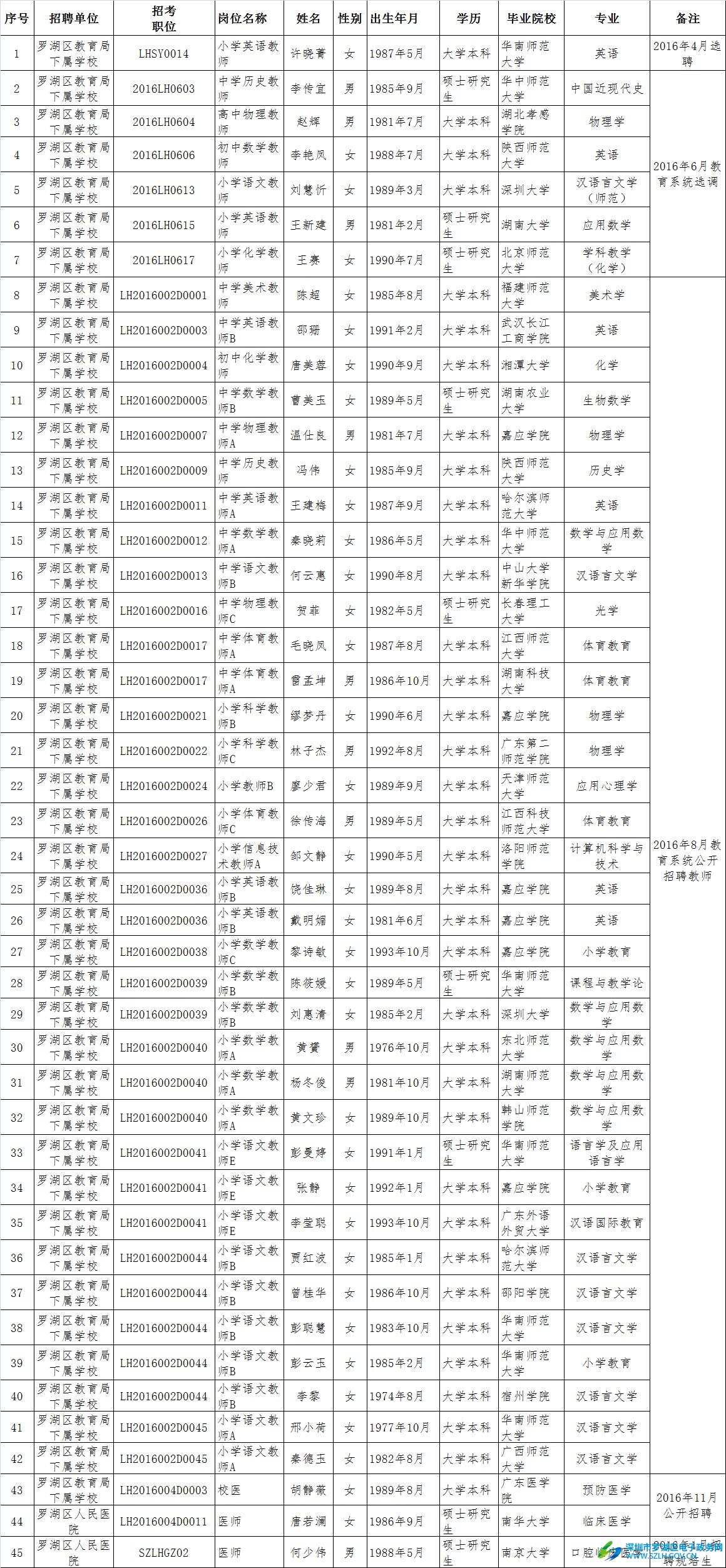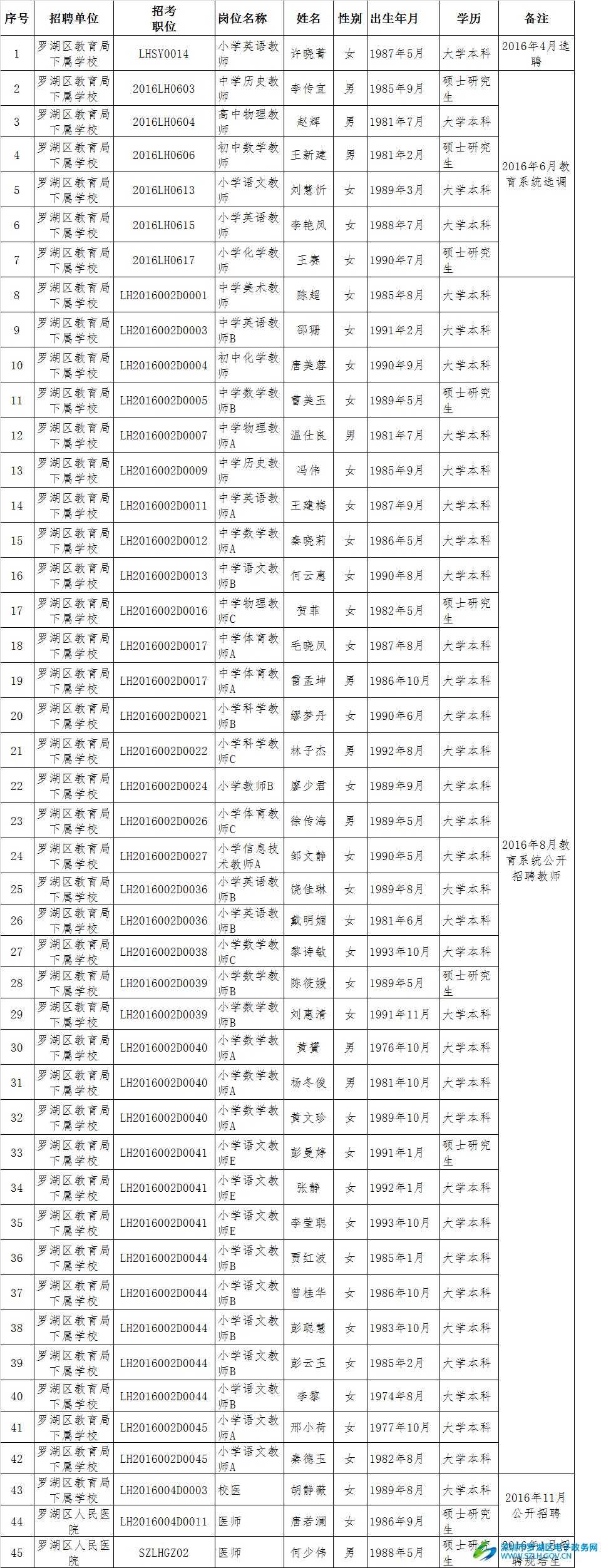 根据招考公告的要求,经公开考试、体检、考察等程序,现对拟聘用人员进行公示,公示时间为2017年4月17日至4月24日。公示期间,任何单位和个人均可通过来人、来电、来信等方式向罗湖区委组织部(地址:深圳市罗湖区文锦中路罗湖管理中心大厦11楼1110室职员与雇员管理科,联系电话: 25666269,投诉电子邮箱:lh_zzbjdk@szlh.gov.cn,邮政编码:518021)反映公示对象存在的问题。反映情况和问题必须实事求是,客观公正。反映人必须提供真实姓名、联系单位、地址和电话,以示负责。罗湖区委组织部对反映人姓名将严格保密,对所反映的情况和问题,将认真进行调查核实,弄清事实真相,并视情况以适当方式向反映情况的单位或个人反馈,调查属实并影响聘用的,取消拟聘用人资格。