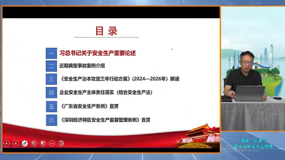 活动邀请应急管理部安全与应急培训讲师张清华为大家讲授习近平总书记关于安全生产重要论述、近期典型事故案例介绍、《安全生产治本攻坚三年行动方案》(2024——2026年)解读、企业安全生产主体责任落实(结合安全生产法)、《广东省安全生产条例》宣贯、《深圳经济特区安全生产监督管理条例》宣贯等。