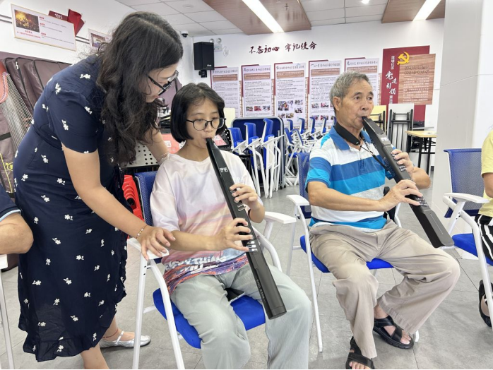 在社区党群服务中心内,居民们正沉浸于各具特色的才艺学习中。莲塘社区新时代文明实践站的电吹管公益课堂吸引了不少爱好者参与。专业老师耐心指导学员们掌握长音、吐音、指法等基本技巧,大家认真练习,并在互帮互助中享受音乐的乐趣。学员们表示,这不仅是技艺的提升,更是情感交流的纽带。