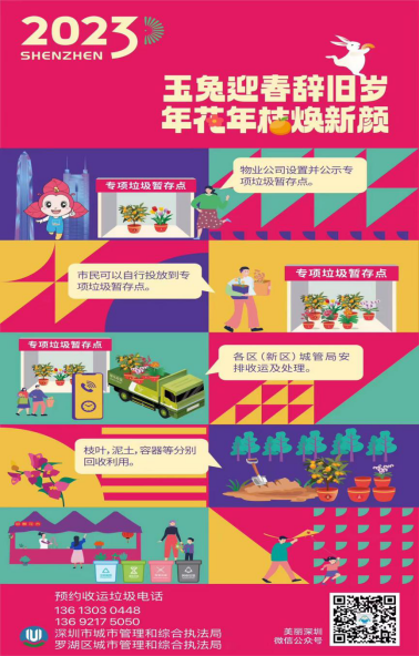 2023年1月29日年花年桔收运处理场地已准备就绪,2月6日至2月19日,居民将年花年桔放至小区指定的年花年桔回收点后,物业管理处通过“美丽深圳”微信公众号、“E分类”APP、电话等方式进行预约回收服务,集中回收服务企业在四十八小时内完成上门免费回收工作,我们配备的宣传及清运小货车穿梭在大街小巷向市民宣传年花年桔回收知识,保障年花年桔回收工作顺利进行。