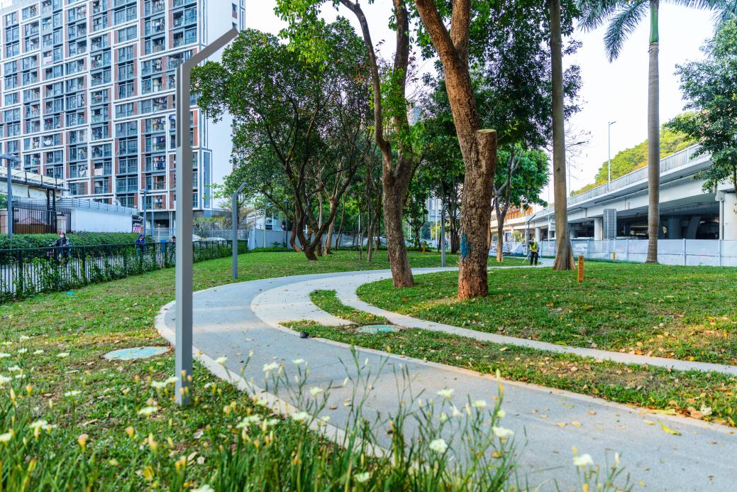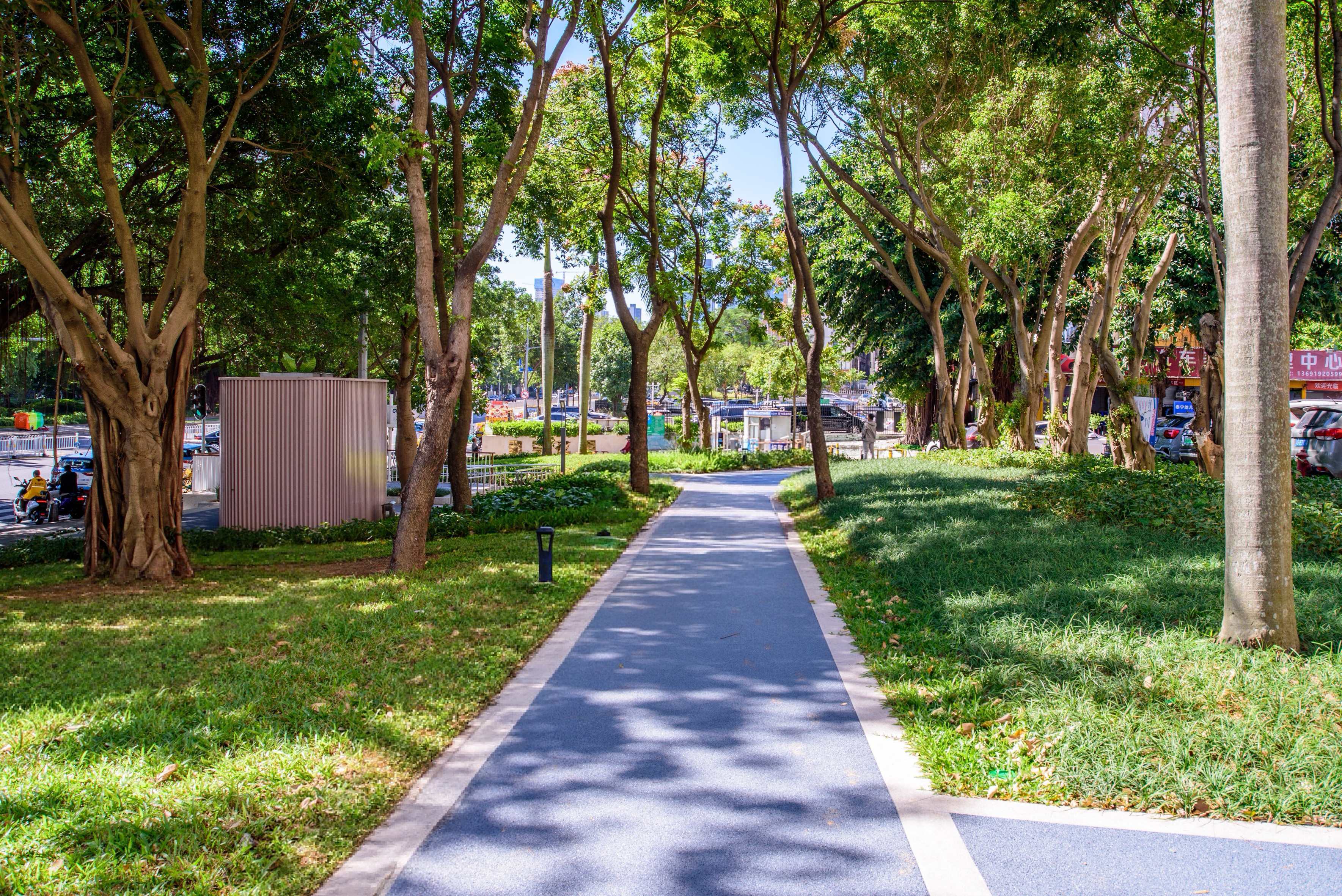 顺着爱国路绿街和文锦中路向南延伸,北斗社区公园作为深圳首个深港睦邻友好示范社区公园,则为绿美深圳注入了浓厚的深港气息。这里是深港融合发展先行区核心区域,周边居住与往来的港籍人群众多,约占辖区总居住人口的8%,我们依托口岸经济带及滨海碧道带,以打造深港睦邻友好街区为支点,不断拓展深港交流的创新实践。其中,北斗社区公园正以榕荫步道为载体,将深港文化融入慢行肌理,让“双城共生”成为最鲜明的标签,也让它成为爱国路绿脉与深港人文脉络交汇的核心节点。