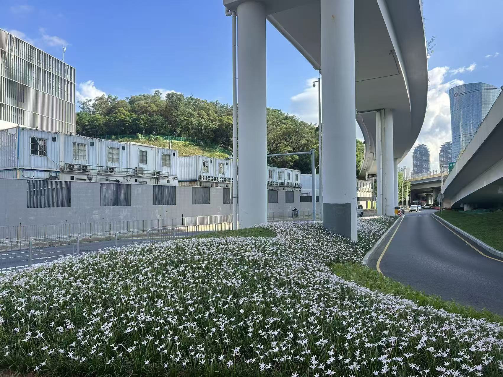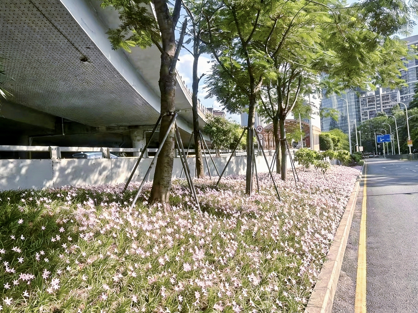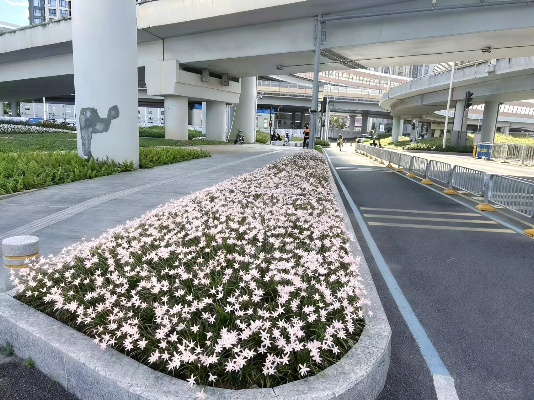 目前,布心路-爱国路交界的桥下空间已初见雏形,杂乱角落被梳理成流畅微坡,点缀的初恋风雨兰花以清新柔美的淡粉色调成为空间主角,兼具极强的耐候性,不惧高温、水淹与严寒,花期从6月绵延至12月,尤其雨后会迎来爆发式绽放,成片粉色花毯绵延起伏,宛如坠入浪漫星河。