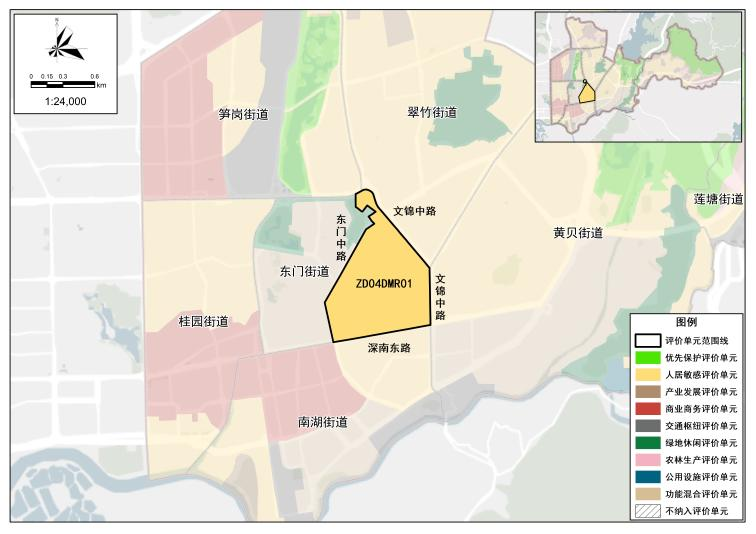 单元范围:本单元位于东门街道。东以文锦中路为界与黄贝街道、翠竹街道相接,西至东门中路,南至深南东路