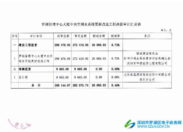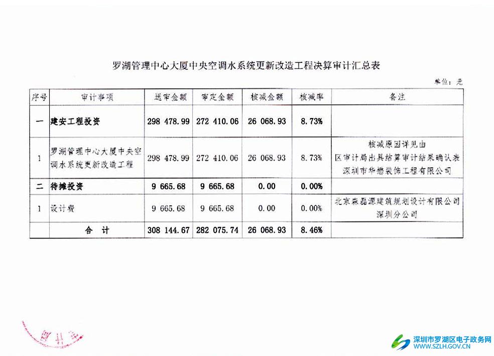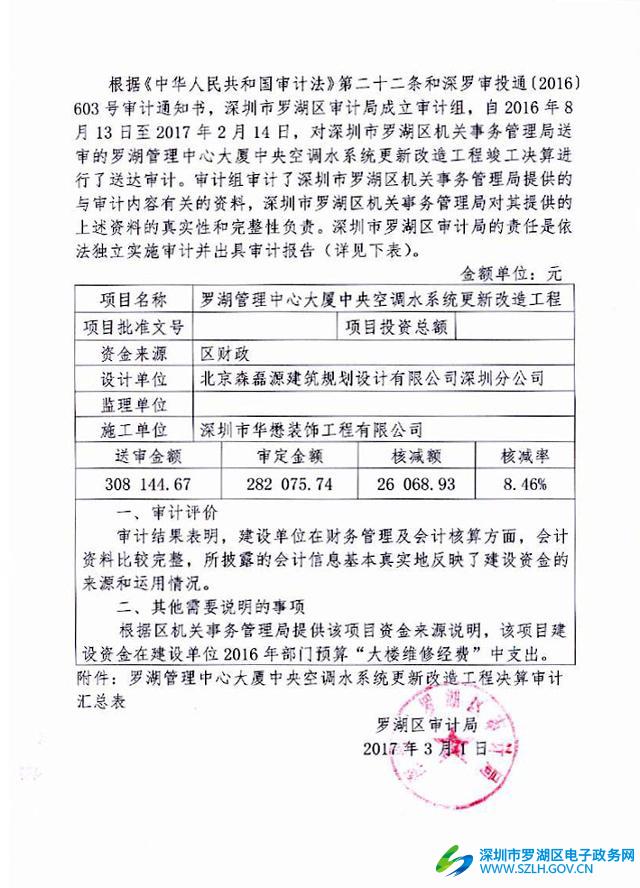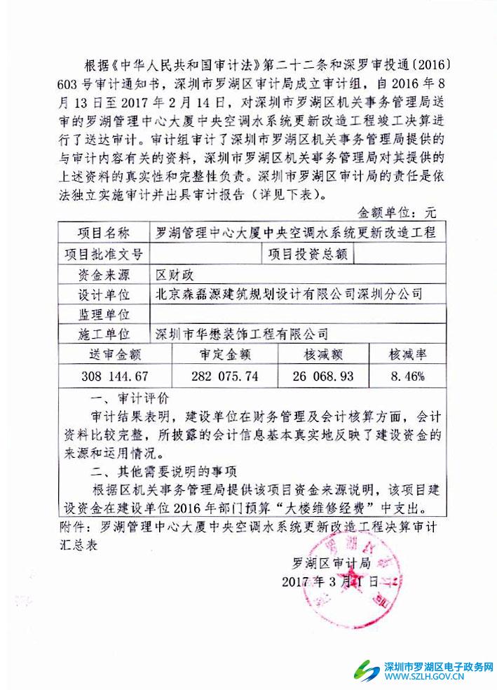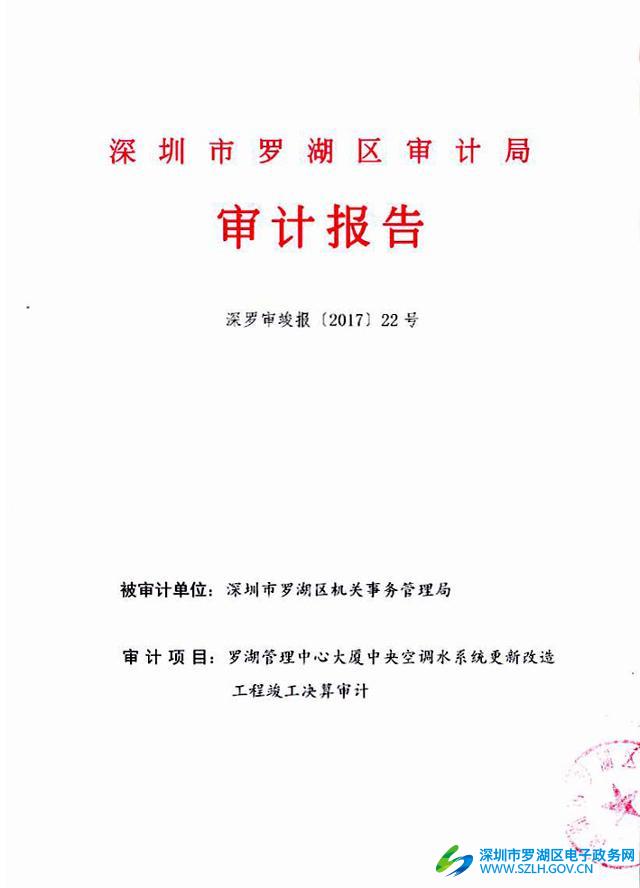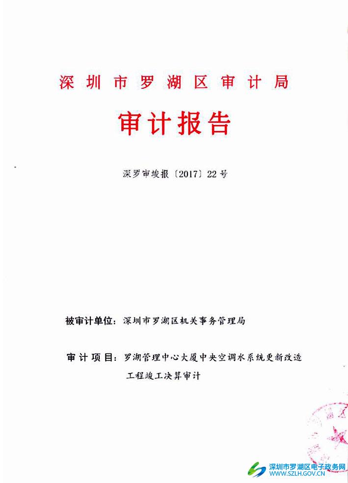 深圳市罗湖区机关事务管理局罗湖管理中心大厦中央空调水系统更新改造工程竣工决算审计