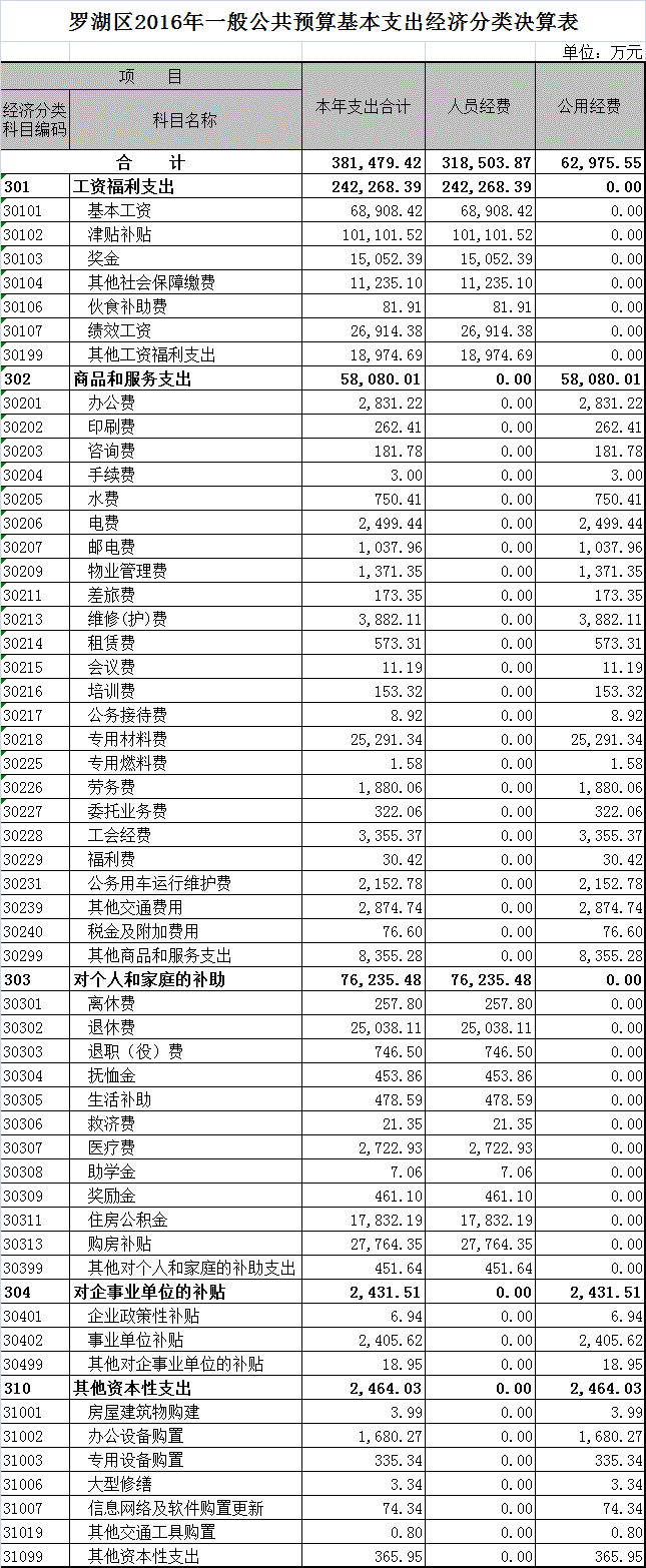 罗湖区2016年一般公共预算基本支出经济分类决算表